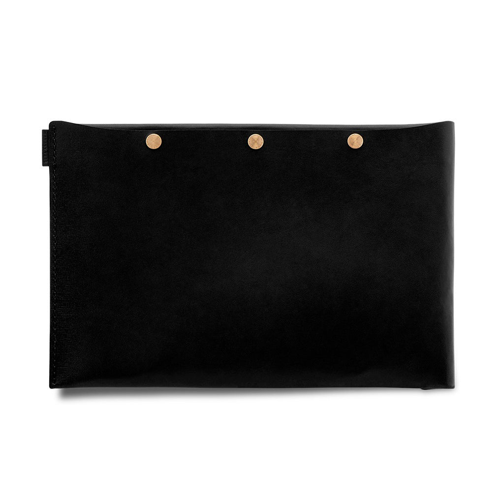 The Ezra Arthur Flat Folio Dopp Kit Jet Black has six sturdy brass snaps that allow it to open completely along two sides, providing easy access to its contents. Crafted of Horween Chromexcel leather, this unique bag is designed to sit on its side or hang from one of three large rivets across the top. You can use it as a compact alternative to a traditional toiletry carrier or to organize items like art supplies and electronic accessories.