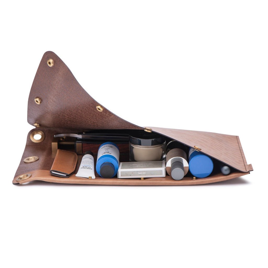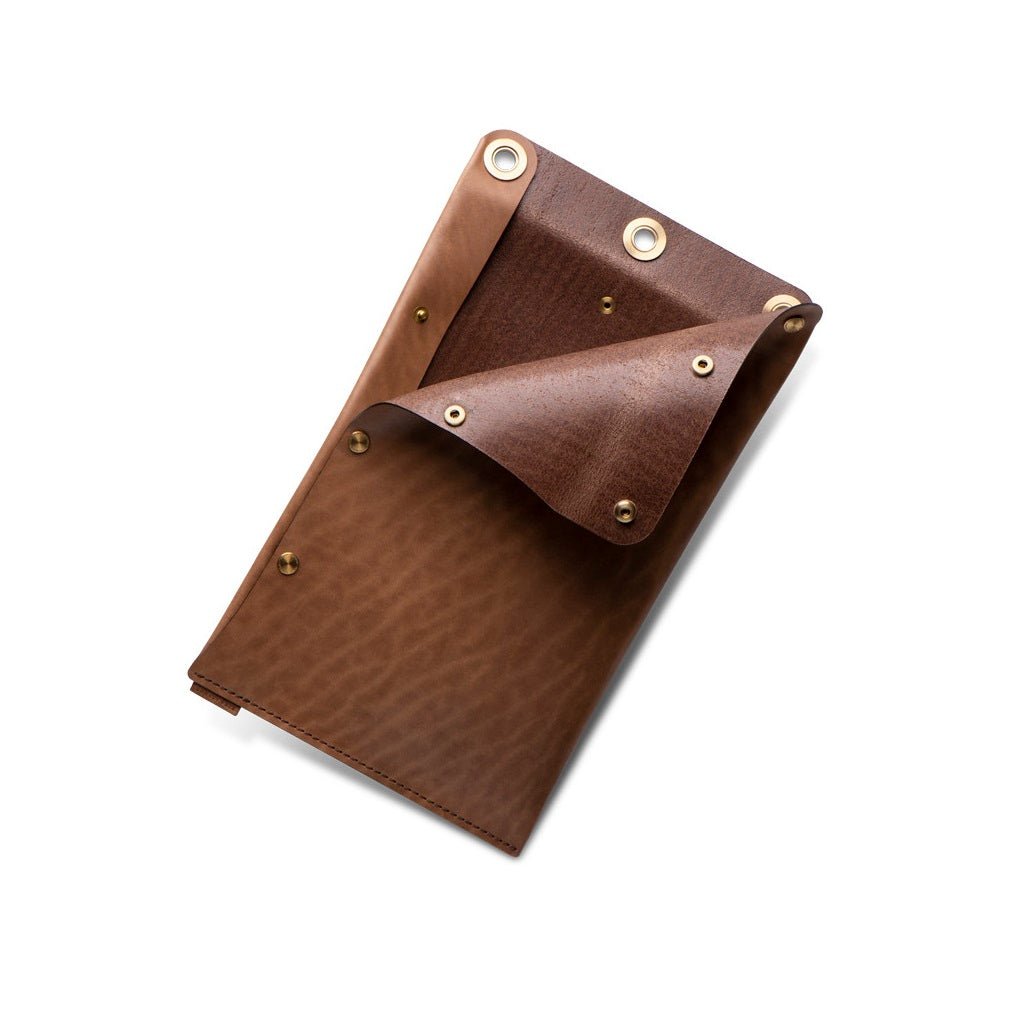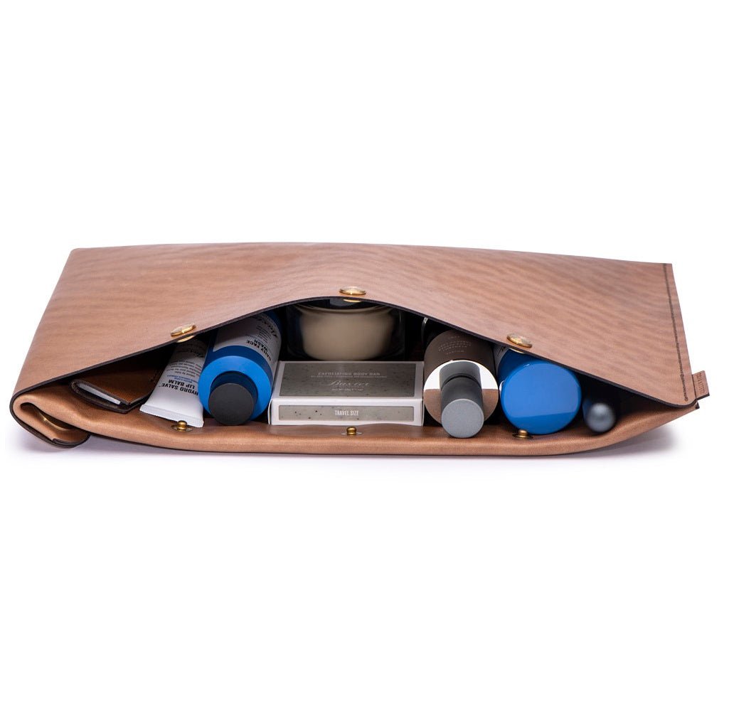 The Ezra Arthur Flat Folio Dopp Kit Whiskey has six sturdy brass snaps that allow it to open completely along two sides, providing easy access to its contents. Crafted of Horween Chromexcel leather, this unique bag is designed to sit on its side or hang from one of three large rivets across the top. You can use it as a compact alternative to a traditional toiletry carrier or to organize items like art supplies and electronic accessories.
